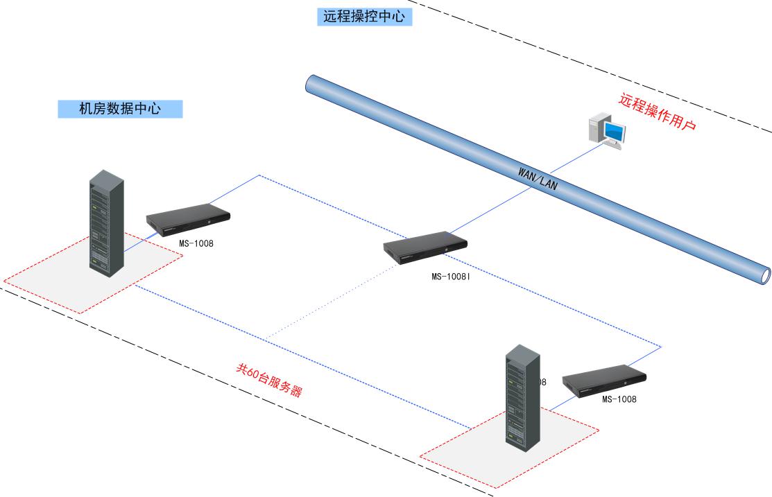 北京西單大悅城機(jī)房內(nèi)共有8個機(jī)柜,60多臺服務(wù)器,8個機(jī)柜并在一起。以前一直采用網(wǎng)絡(luò)遠(yuǎn)程方式(如3389 遠(yuǎn)程桌面,或者Telnet進(jìn)行管理)管理,現(xiàn)場需要臨時插顯示器使用,線纜繁雜,并且每臺機(jī)柜都配置鍵鼠和一臺顯示器,使用的時候臨時將其插到服務(wù)器,不能對服務(wù)器進(jìn)行BIOS層次操作,并存在安全隱患,管理效率低。